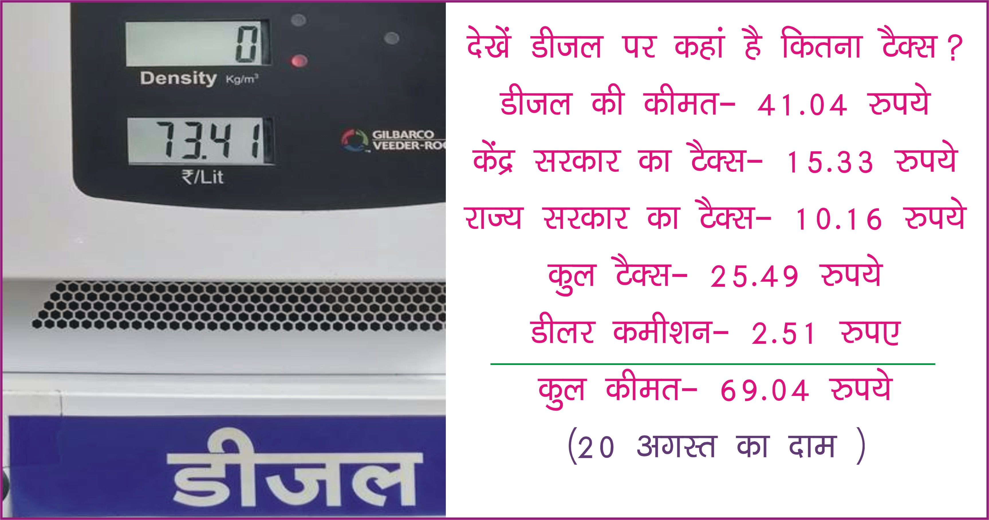 सरकार हमेशा से यह कहती रही है कि पेट्रोल और डीजल के दाम हम तय नहीं करते, बाजार तय करता है. लेकिन सरकार सच नहीं बताती है कि पेट्रोल और डीजल पर लगने वाले टैक्स से कितनी कमाई हो रही है. विदित हो कि डीजल की कीमत 41 रुपये है लेकिन टैक्स लगाकर सरकारी तेल कंपनियां 70 रुपये प्रति लीटर बेच रही हैं. सरकार एक लीटर पर करीब 29 रुपये की कमाई कर रही है.